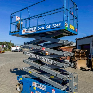 Zasilanie podnośnika nożycowego Genie GS 3246 zapewnia akumulator 24 V DC, w urządzenie wbudowana jest też uniwersalna ładowarka sieciowa (20 A). Seria GS pozwala operatorowi zwyżki używać dwóch prędkości podnoszenia i jazdy, dodatkowo obsługiwać można ją joystickiem. Producent zadbał o pokładowy system diagnostyczny, zawór ręcznego opuszczania platformy oraz opcję zatrzymywania awaryjnego. Koła wykonano z niebrudzącego materiału, dodatkowo przednie i tylne opony mają hamulce (tylne – wielotarczowe, przednie – hydrauliczne). Podczas jazdy osoba obsługująca nie musi obawiać się o nierówny teren, ponieważ podnośnik ma osłony przed wybojami.